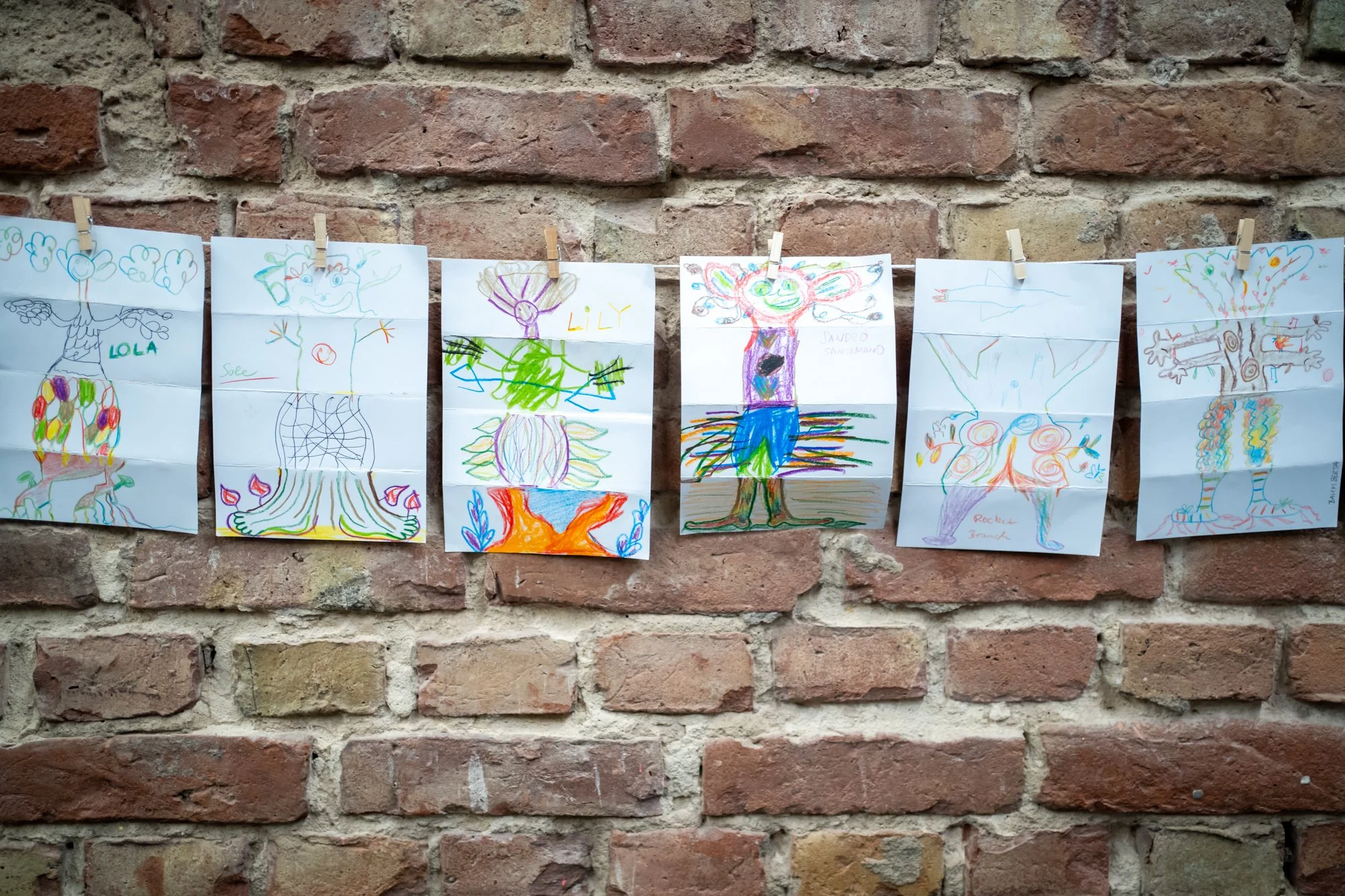 6 hand and very colourful drawings depicting creatures partly humans partly trees hanged with a wooden peg on a string agains a red brick wall. Photos by David Beecroft Frtaz Festival - Berlin 2024